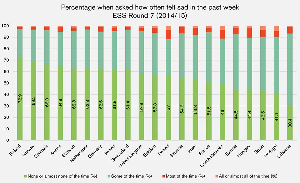 72.9% of Finnish respondents did not feel sad in the past week, compared with 30.4% of Lithuanians