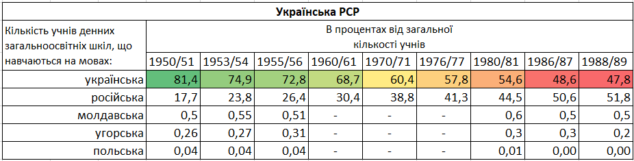 До кінця розвалу СРСР кількість учнів, що навчались українською мовою в Україні, впала з 81% до нижче 48%.