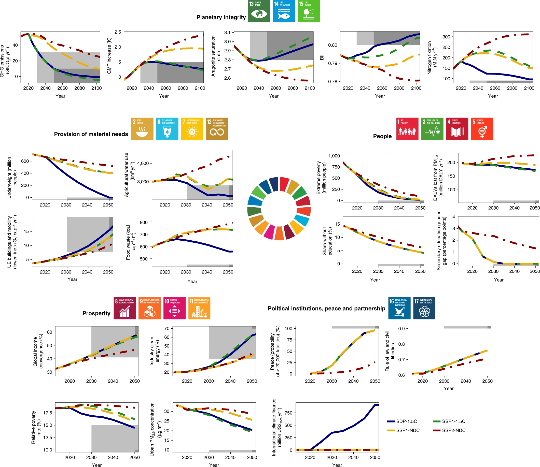 We compare our sustainable development pathway scenario (SDP-1.5C) to a number of other scenarios (main text). Grey shaded areas illustrate the target values (light shading for 2030 and dark shading for 2050), where available. All indicators are global sums or (population-weighted) averages, with the exception of useful energy (UE) per capita where we show an average of lower-income regions (REMIND–MAgPIE regions, Sub-Saharan Africa, India, East Asian countries except for China and Japan). ‘Global income convergence’ is the ratio of global GDP per capita to the OECD GDP per capita. For the ‘planetary integrity’ cluster we show results until 2100; otherwise, we restrict them to the time horizon until 2050. DALYs, disability-adjusted life years; PM2.5, fine particulate matter (diameter <2.5 μm); cap, capita; BII, biodiversity intactness index.